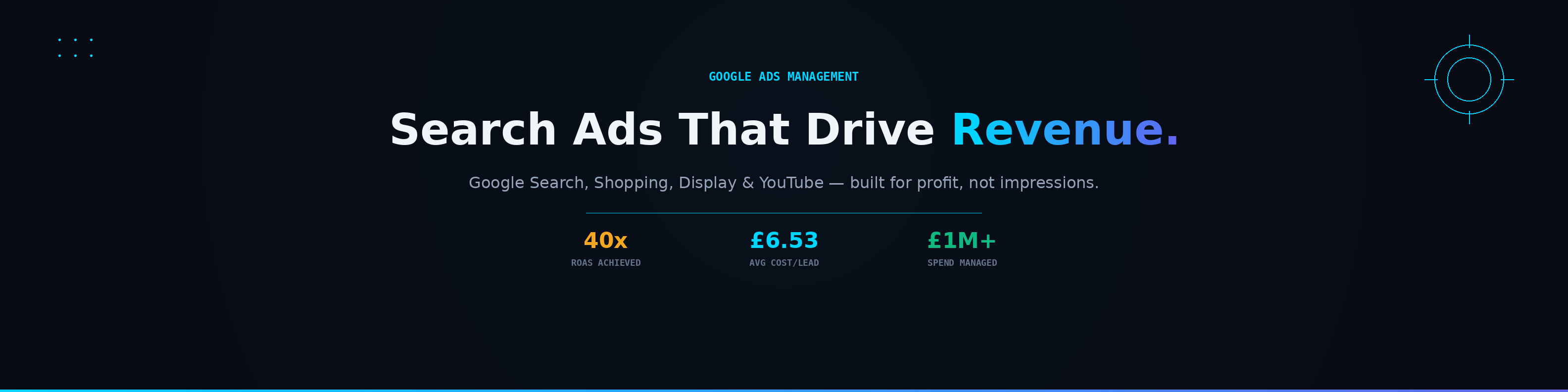 Most Google Ads accounts waste 40-60% of their budget. We build campaigns focused on revenue and profit - not impressions, not clicks, not vanity metrics. Just results that show up in your bank account.